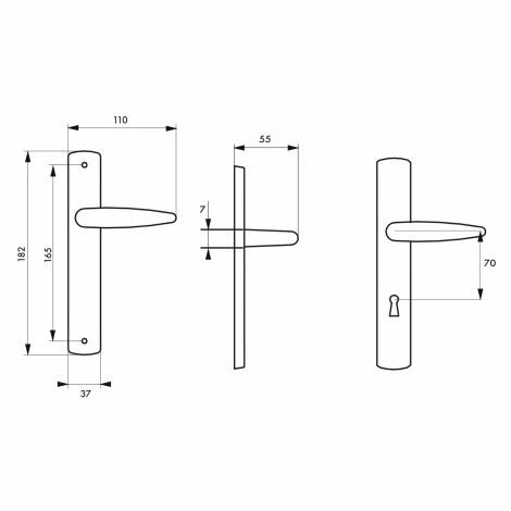 Plaques acier embouti. Béquilles alliage fondu. carré acier 7 mm. Vis métaux sécables. Entr’axe de fixation 165 mm.