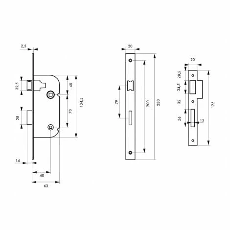 Coffre acier embouti. Têtière acier. Demi-tour alliage réversible sans démontage du coffre. Pêne acier. Gâche plate acier. Carré 7 mm, entr’axe 70 mm.