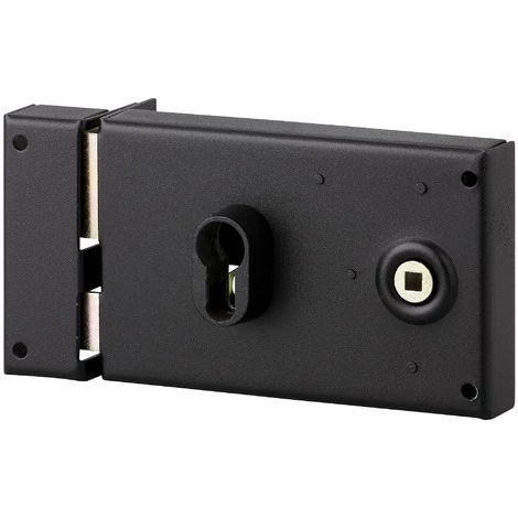 Coffre et gâche acier cambré, pêne acier, demi-tour acier, mécanisme à 2 tours carré 6 mm finition époxy noir granité