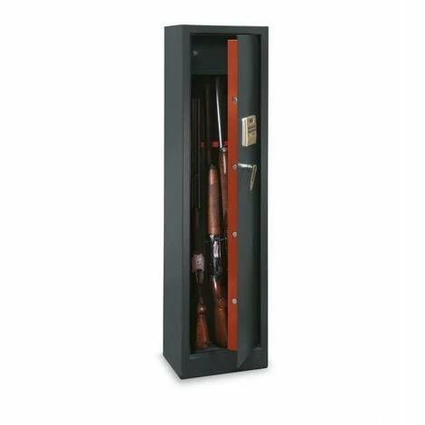 Structure en acier monobloc d’épaisseur 2 mm. Porte d’épaisseur 3 mm. Epaisseur totale de la porte avec la serrurerie: 55 mm. Serrure contrôlée par un système électronique à mémoire non volatile. Clavier à boutons poussoirs en abs spécial. Ecran LCD (à cristaux liquides) lumineux à 8 positions. Alimentation par 4 piles de 1.5 V AA (non fournies). 4 pênes en acier nickelé à 20 mm. Rtelier en caoutchouc et tapis à la base. Coffret intérieur pour munitions avec fermeture à clé. Tapis à la base. Trous pour fixation au dos et à la base (2+2). Peinture époxy au four. Serrure à clé pour ouverture en cas d’urgence (2 clés fournies).