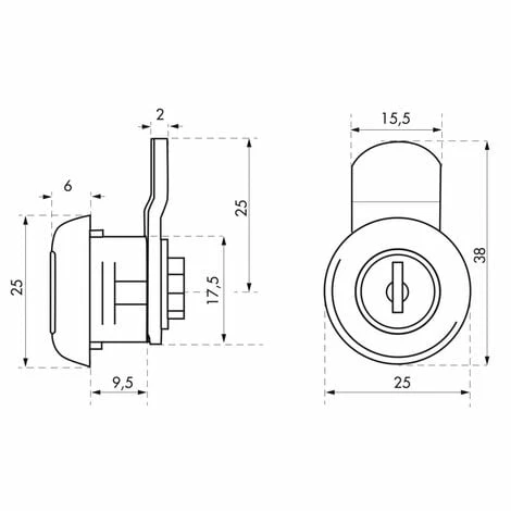 Corps alliage moulé. Mécanisme à paillettes. Came coudée vers l’arrière montée à 12h. 2 clés nickelées. Griffe de fixation.