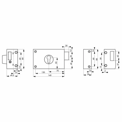 Coffre et gâche acier cambré. Pêne soudé acier zingué. Mécanisme à 2 tours.