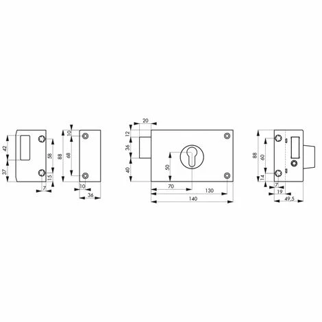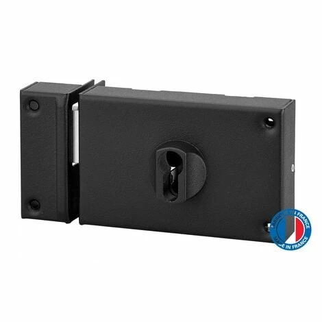 Coffre et gâche acier cambré. Pêne soudé acier zingué. Mécanisme à 2 tours.- Dimension : 140x88mm