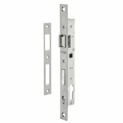 Coffre acier. Têtière inox. Demi-tour réversible sans démontage du coffre. Pêne alliage nickelé. Gâche plate inox. Carré 8 mm avec fourreau réducteur 7 mm. Entr’axe 70 mm