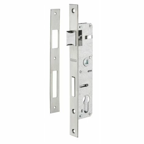 Coffre acier. Têtière inox. Demi-tour réversible sans démontage du coffre. Rappel du 1/2 tour par la clé. Pêne alliage nickelé. Gâche plate inox. Carré 8 mm avec fourreau réducteur 7 mm. Entr’axe 70 mm.