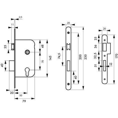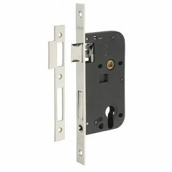 Coffre acier embouti. Têtière acier, laiton ou inox. Demi-tour alliage zingué réversible sans démontage du coffre. Pêne alliage zingué ou laiton. Gâche plate acier. Mécanisme à 2 tours. Rappel du 1/2 tour par la clé. Carré 7 mm, entr’axe 70 mm.