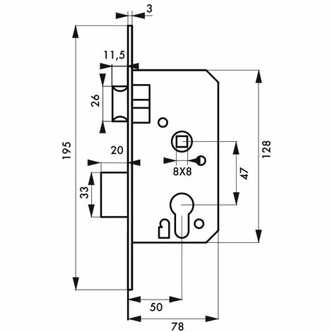 Coffre acier embouti. Têtière acier bouts ronds. Demi-tour réversible sans démontage du coffre. Pêne alliage zingué. Gâche plate acier. Carré 8 mm, entr’axe 47 mm. Rappel du 1/2 tour par la clé.Ce boitier de serrure à encaster en acier équipera parfaitement votre porte d’entrée. Choisissez votre niveau de sécurité, en ajoutant à cette serrure le cylindre de votre choix. Cette serrure s’installe facilement à votre porte et offre un verrouillage efficace de votre porte pour garantir votre sécurité et celle de vos biens. Ce coffre de serrure est doté d’un mécanisme à rappel du demi-tour par la clé et d’une têtière à bouts arrondis disponible en finition laitonnée ou nickelée. Ce boitier de serrure de porte à encastrer de la marque Thirard mesure 13cm de haut.- Dimension : 78x128mm