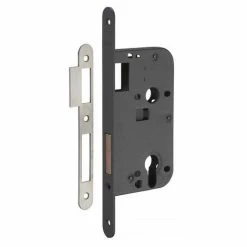 Coffre acier embouti. Têtière acier, laiton ou inox. Demi-tour alliage zingué réversible sans démontage du coffre. Pêne alliage zingué ou laiton. Gâche plate acier. Mécanisme à 2 tours. Rappel du 1/2 tour par la clé. Carré 7mm, entr’axe 70 mm.- Dimension : 79x145mm