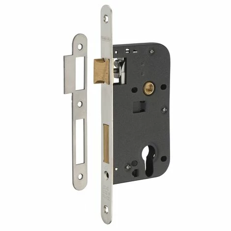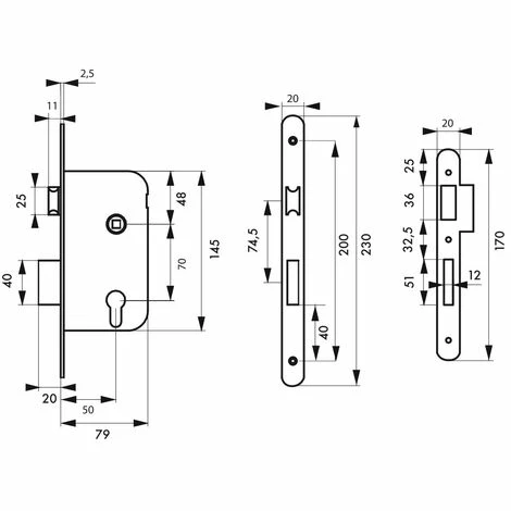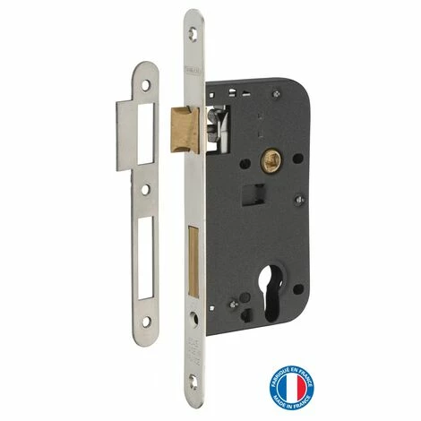 Coffre acier embouti. Têtière acier, laiton ou inox. Demi-tour alliage zingué réversible sans démontage du coffre. Pêne alliage zingué ou laiton. Gâche plate acier. Mécanisme à 2 tours. Rappel du 1/2 tour par la clé. Carré 7mm, entr’axe 70 mm.- Dimension : 79x145mm