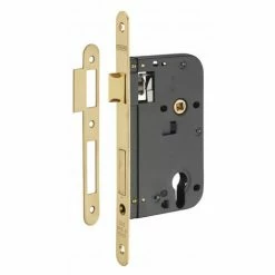 Coffre acier embouti. Têtière laiton. 1/2 tour laiton réversible sans démontage du coffre. Pêne laiton. Rappel du 1/2 tour par la clé. Carré 7mm, entr’axe 70 mm. Gâche plate selon finition.- Dimension : 88.5x145mm