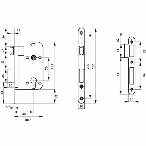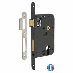 Coffre acier embouti. Têtière laiton. 1/2 tour laiton réversible sans démontage du coffre. Pêne laiton. Rappel du 1/2 tour par la clé. Carré 7mm, entr’axe 70 mm. Gâche plate selon finition.- Dimension : 88.5x145mm