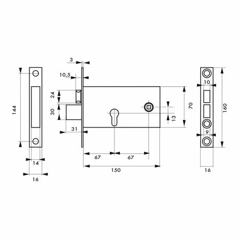 Coffre acier zingué plastifié. Têtière inox largeur 22mm. Demi-tour laiton réversible. Carré 8 mm, entr’axe 67 mm. Livrée sans gâche.Ce boitier de serrure à encaster en acier est conçu pour verrouiller efficacement votre porte d’entrée. Cette serrure est destinée à être complétée avec la gâche et le cylindre profilé de votre choix, vous permettant de choisir votre niveau de sécurité. Dotée d’un demi-tour en laiton réversible, cette serrure s’installe facilement et offre un verrouillage optimal de votre porte pour garantir votre sécurité et celle de vos biens. Ce boitier de serrure à encastrer Thirard dispose d’un axe à 67mm et d’une têtière à bouts carrés en inox.- Dimension : 70x150mm