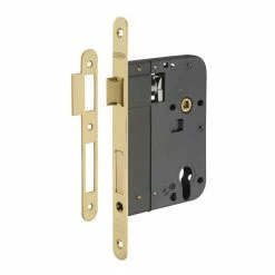 Coffre acier embouti. Têtière laiton. 1/2 tour laiton réversible sans démontage du coffre. Pêne laiton. Rappel du 1/2 tour par la clé. Carré 7mm, entr’axe 70 mm. Gâche plate selon finition.- Dimension : 108.5x145mm