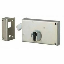 Coffre et gâche acier cambré. Crochet acier zingué. Mécanisme à 2 tours.- Dimension : 140x83mm