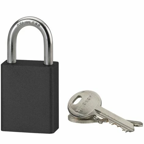 Corps en aluminium massif anodisé. Anse inox. Double verrouillage par billes inox. Mécanisme à goupilles. Bloc de sûreté interchangeable avec protection contre le perçage. 2 clés acier nickelé.- Dimension : 38 mm