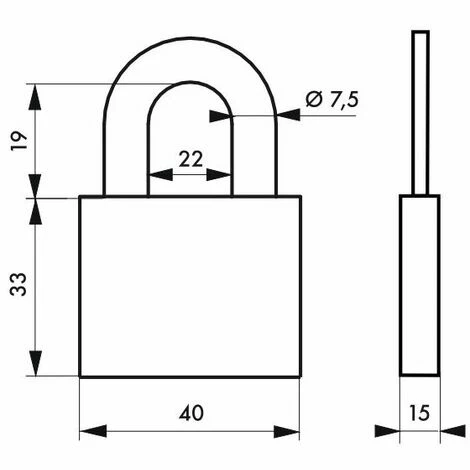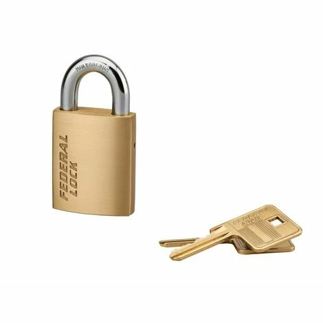 Corps laiton monobloc. Anse acier cémenté nickelé interchangeable. Mécanisme à goupilles, protection contre le perçage et le crochetage par 2 goupilles en acier traité. Double verrouillage par billes. Bloc de sûreté interchangeable. 2 clés.- Dimension : 40 mm
