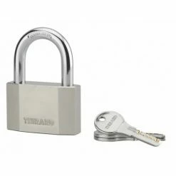 Corps acier. Anse acier cémenté nickelé. Mécanisme à goupilles. Double verrouillage par billes. Trou d’écoulement d’eau. 3 clés réversibles.