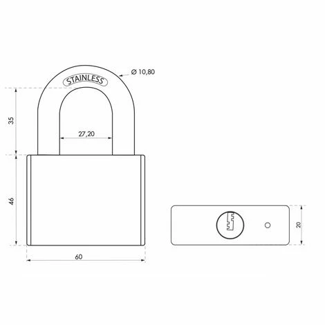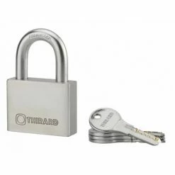 Corps inox. Anse inox. Mécanisme à goupilles. Double verrouillage par billes. Trou d’écoulement d’eau. 4 clés réversibles.