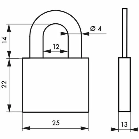 Corps laiton monobloc. Anse acier nickelé. Mécanisme à goupilles. Protection contre le perçage et le crochetage par 2 goupilles acier traité. Simple verrouillage. 2 clés.- Dimension : 25 mm