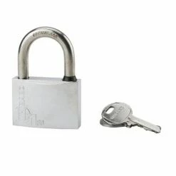 Corps laiton chromĂ© monobloc. Anse acier inoxydable. MĂ©canisme Ă goupilles. Double ancrage. Trou d’Ă©coulement d’eau. 2 clĂ©s acier nickelĂ©.- Dimension : 60 mm