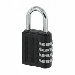 Corps alliage moulé. Anse acier nickelé. Mécanisme à 4 viroles. Combinaison modifiable (10 000 combinaisons possibles).