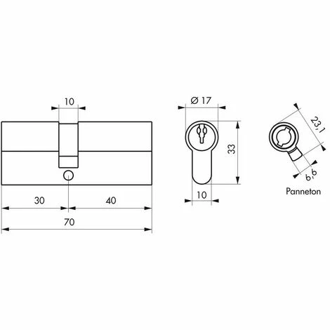 Doté d’un profil européen, ce cylindre est composé d’un mécanisme à 5 goupilles et d’un panneton anti-arrachement. Ces accessoires de qualité sont une protection diminuant le risque d’intrusion. Garanti 2 ans, ce cylindre de la marque Thirard est fourni avec ses trois clés en acier nickelé et sa vis de fixation. La taille de vis nécessaire est définie par votre type de porte : 40mm pour les portes vitrées, 45 ou 50 pour les portes en PVC ou aluminium et 60 pour les portes en bois.Ce modèle de cylindre est également décliné en plusieurs tailles allant du demi-cylindre de 30 x 10mm au cylindre à double entrée ou à bouton en 40 x 50mm.