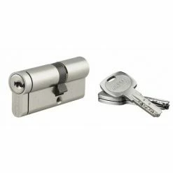 Profil européen laiton. Mécanisme à 7 à 16 goupilles.Protection contre l’effraction de la partie saillante ducylindre (anti-snap). Panneton anti arrachement. 3 clésplates réversibles laiton nickelé avec carte de propriété.Option : Protection contre le perçage par aiguille + 1ère goupille + poussoir en acier trempé.