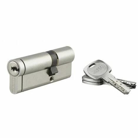 Profil européen laiton. Mécanisme à 7 à 16 goupilles.Protection contre l’effraction de la partie saillante ducylindre (anti-snap). Panneton anti arrachement. 3 clésplates réversibles laiton nickelé avec carte de propriété.Option : Protection contre le perçage par aiguille + 1ère goupille + poussoir en acier trempé.