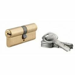 Profil européen laiton. Mécanisme à 6 goupilles. Protection contre le perçage par aiguille en acier trempé. Panneton anti arrachement. 5 clés plates réversibles acier nickelé.
