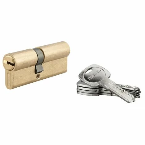Profil européen laiton. Mécanisme à 6 goupilles. Protection contre le perçage par aiguille en acier trempé. Panneton anti arrachement. 5 clés plates réversibles acier nickelé.