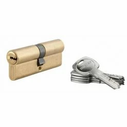 Profil européen laiton. Mécanisme à 6 goupilles. Protection contre le perçage par aiguille en acier trempé. Panneton anti arrachement. 5 clés plates réversibles acier nickelé.