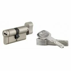Profil européen laiton. Mécanisme à 6 goupilles protection contre le crochetage. Protection contre le perçage par 1ère goupille + poussoir en acier trempé. Protection contre l’effraction de la partie saillante du cylindre (anti-snap). Panneton anti arrachement. 5 clés plates réversibles laiton nickelé avec carte personnelle.