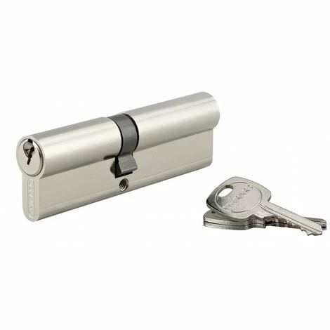 Profil européen laiton. Mécanisme à 5 goupilles. Panneton anti arrachement. 3 clés en laiton nickelé.- Dimension : 45×55 mm