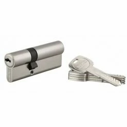 Profil européen laiton. Mécanisme à 6 goupilles contre le crochetage. Protection contre le perçage par aiguille et 1ère goupille en acier trempé. Panneton anti arrachement. Fonction urgence Panneton débrayable : ouverture possible de l’extérieur même si une clé est restée à l’intérieur (sauf conditionnement en boite). 5 clés plates réversibles laiton nickelé avec carte de propriété.