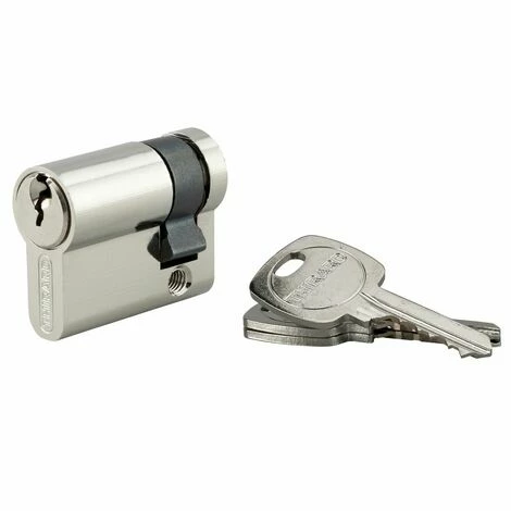 Profil européen laiton. Mécanisme à 5 goupilles. Panneton anti arrachement. 3 clés en laiton nickelé.- Dimension : 30×10 mm