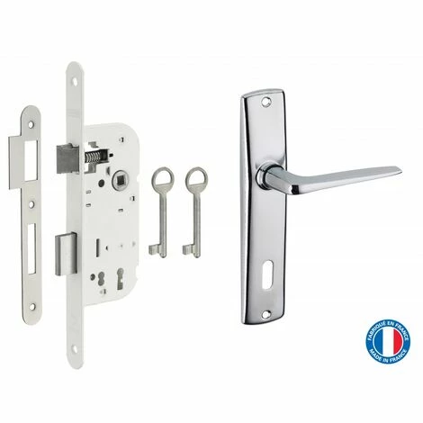 Coffre acier embouti. Têtière acier. Demi-tour alliage réversible sans démontage du coffre. Pêne acier. Gâche plate acier. Carré 7mm, entr’axe 70 mm. 1 clé. 6 variures.- Axe : 40 mm