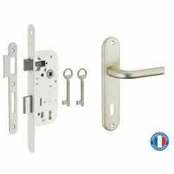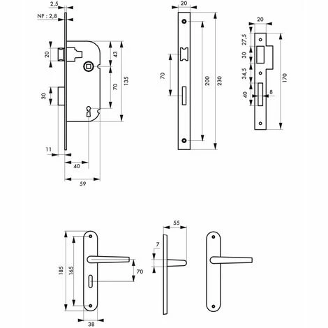 Coffre acier embouti. Têtière acier. Demi-tour alliage réversible sans démontage du coffre. Pêne acier. Gâche plate acier. Mécanisme à 1 ou 2 tours (avec 2 clés). Carré 7mm, entr’axe 70 mm. 1 clé. 6 variures.- Axe : 40 mm