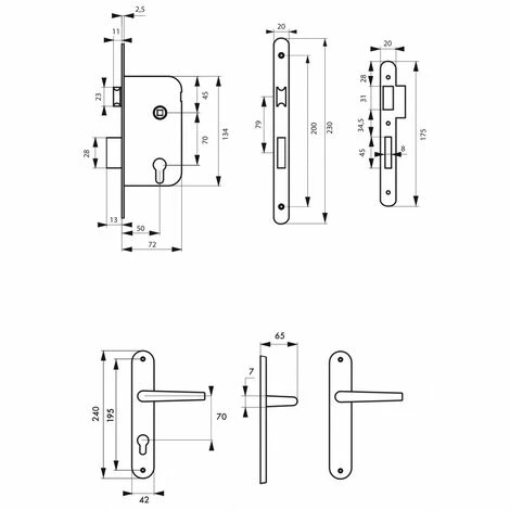 Coffre acier embouti épaisseur 10 mm. Têtière acier. Demi-tour alliage zingué réversible sans démontage du coffre. Pêne acier zingué. Gâche plate acier. Carré 7mm, entr’axe 70 mm. Sans rappel du 1/2 tour par la clé.- Axe : 50 mm