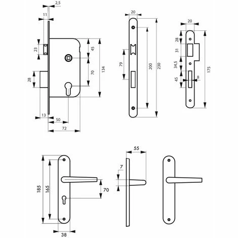 Coffre acier embouti épaisseur 10 mm. Têtière acier. Demi-tour alliage zingué réversible sans démontage du coffre. Pêne acier zingué. Gâche plate acier. Carré 7mm, entr’axe 70 mm. Sans rappel du 1/2 tour par la clé.- Axe : 50 mm