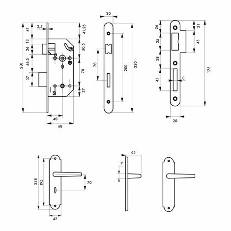 Coffre acier embouti. Têtière acier bouts ronds. Demi-tour bipente alliage réversible sans démontage du coffre. Pêne acier galvanisé. Gâche plate acier zingué. Carré 7mm, entr’axe 70 mm.