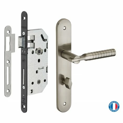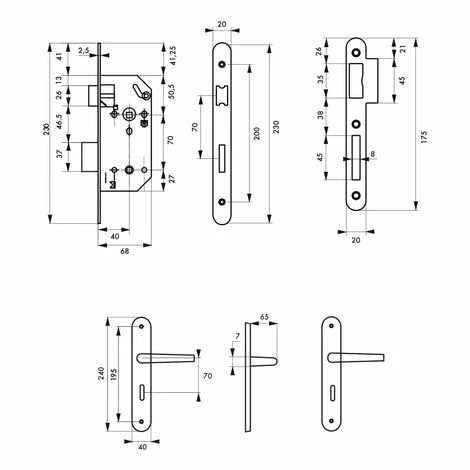 Coffre acier embouti. Têtière acier bouts ronds. Demi-tour bipente alliage réversible sans démontage du coffre. Pêne acier galvanisé. Gâche plate acier zingué. Carré 7mm, entr’axe 70 mm.