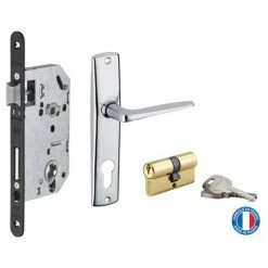 Coffre acier embouti. Têtière acier bouts ronds. Demi-tour bipente alliage réversible sans démontage du coffre. Pêne acier galvanisé. Gâche plate acier zingué. Mécanisme à 2 tours. Rappel du 1/2 tour par la clé. Carré 7mm, entr’axe 70 mm.