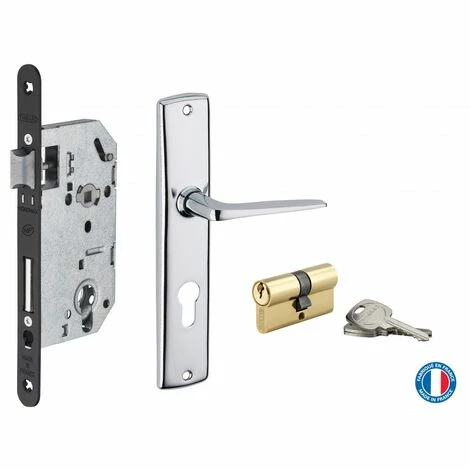 Coffre acier embouti. Têtière acier bouts ronds. Demi-tour bipente alliage réversible sans démontage du coffre. Pêne acier galvanisé. Gâche plate acier zingué. Mécanisme à 2 tours. Rappel du 1/2 tour par la clé. Carré 7mm, entr’axe 70 mm.