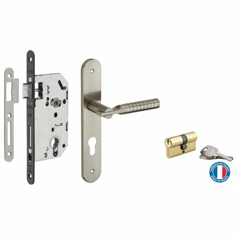 Coffre acier embouti. Têtière acier bouts ronds. Demi-tour bipente alliage réversible sans démontage du coffre. Pêne acier galvanisé. Gâche plate acier zingué. Mécanisme à 2 tours. Rappel du 1/2 tour par la clé. Carré 7mm, entr’axe 70 mm.