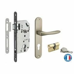Coffre acier embouti. Têtière acier bouts ronds. Demi-tour bipente alliage réversible sans démontage du coffre. Pêne acier galvanisé. Gâche plate acier zingué. Mécanisme à 2 tours. Rappel du 1/2 tour par la clé. Carré 7mm, entr’axe 70 mm.