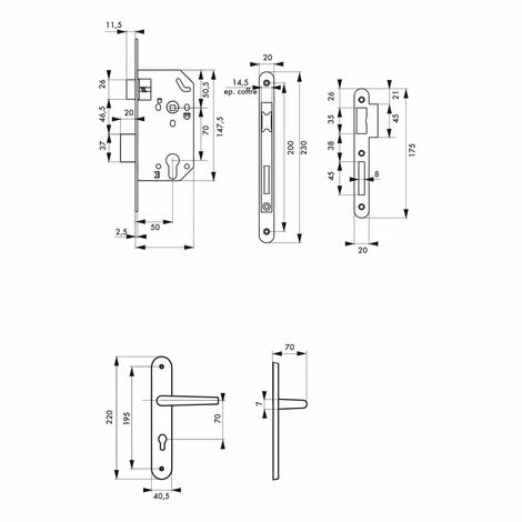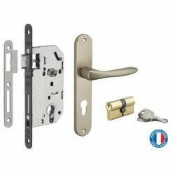 Coffre acier embouti. Têtière acier bouts ronds. Demi-tour bipente alliage réversible sans démontage du coffre. Pêne acier galvanisé. Gâche plate acier zingué. Mécanisme à 2 tours. Rappel du 1/2 tour par la clé. Carré 7mm, entr’axe 70 mm.