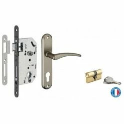 Coffre acier embouti. Têtière acier bouts ronds. Demi-tour bipente alliage réversible sans démontage du coffre. Pêne acier galvanisé. Gâche plate acier zingué. Mécanisme à 2 tours. Rappel du 1/2 tour par la clé. Carré 7mm, entr’axe 70 mm.