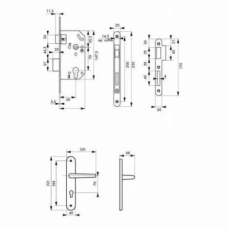 Coffre acier embouti. Têtière acier bouts ronds. Demi-tour bipente alliage réversible sans démontage du coffre. Pêne acier galvanisé. Gâche plate acier zingué. Mécanisme à 2 tours. Rappel du 1/2 tour par la clé. Carré 7mm, entr’axe 70 mm.