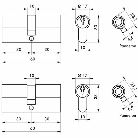 Lot de 2 produits s’ouvrant avec la même clé. Possibilité de commander des verrous, cadenas et cylindres profilés complémentaires sur le même numéro de clé. En utilisant des serrures et des verrous équipés d’un cylindre profilé interchangeable, on peut répondre à tous types de fermeture avec la même clé. 6 clés acier nickelé.Verrou de sûreté, cadenas et cylindre, à clé unique, c’est possible. Ne vous encombrez plus de dizaine de clés, ouvrez toute votre maison avec une unique clé : portail, porte d’entrée, fenêtre, garage, barre de volet, abri de jardin… Ces lots de deux ou trois systèmes de fermeture Thirard sont livrés avec six clés en acier identiques pour pouvoir partager l’accès avec toute la famille. Adaptable sur toute type d’ouverture, différents lots sont disponibles composés de : verrous à bouton ou à double cylindre, cadenas et cylindres profilés. Simplifiez-vous la vie avec une seule et même clé pour toute votre maison ou appartement !- Dimension : 30×30 mm
