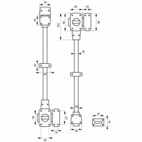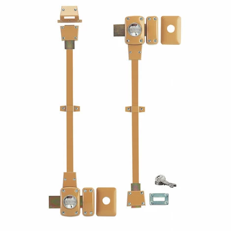 Coffre acier embouti. Gâche acier embouti. Pênes acier chromé. Bouton à barette ABS chromé. Cylindre laiton à 5 goupilles 45 mm. Tringles en acier. 2 points 1×460 mm. 4 points 2×460 mm. 1 Plaque de renfort par verrou. 3 clés en acier nickelé.